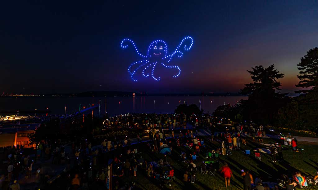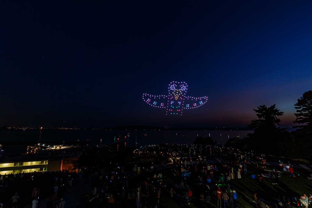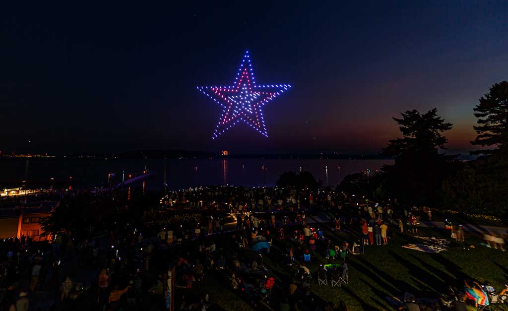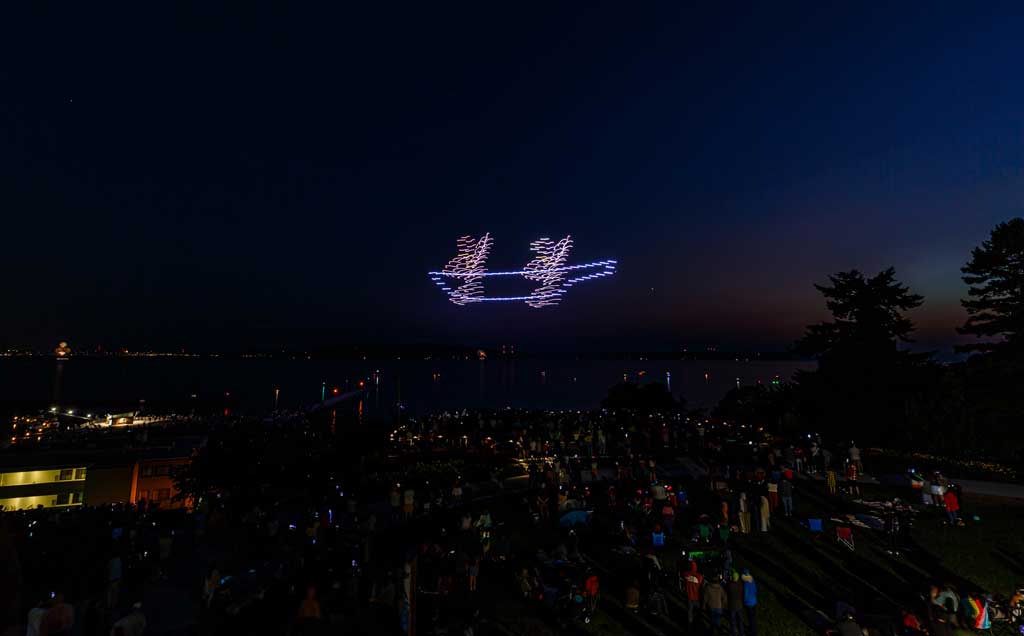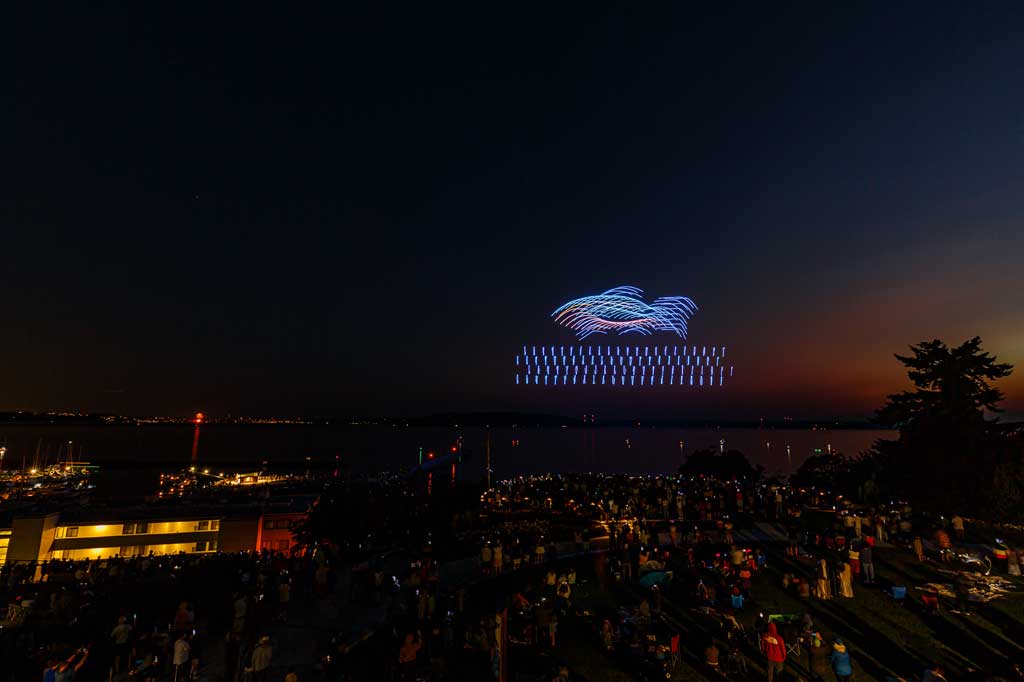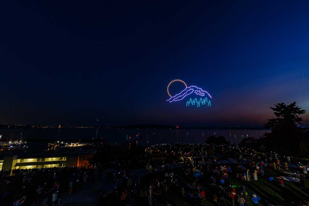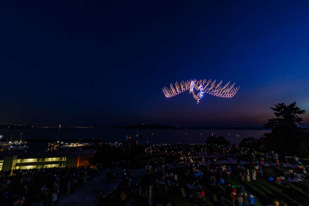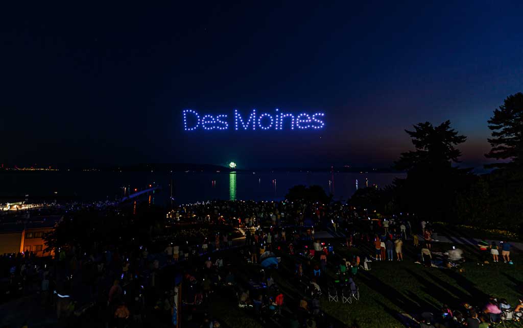 This was the first such large aerial exhibition of its kind over Des Moines, put on with 175 or so drones that made spectacular displays via computer programming – all without explosions, pollution or chemicals raining down into Puget Sound.
