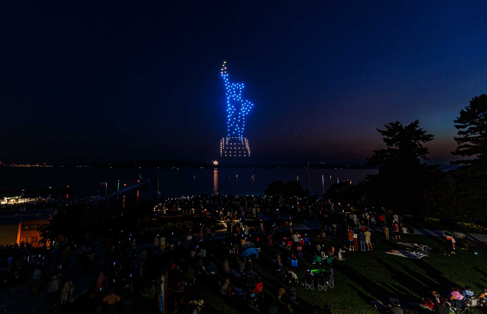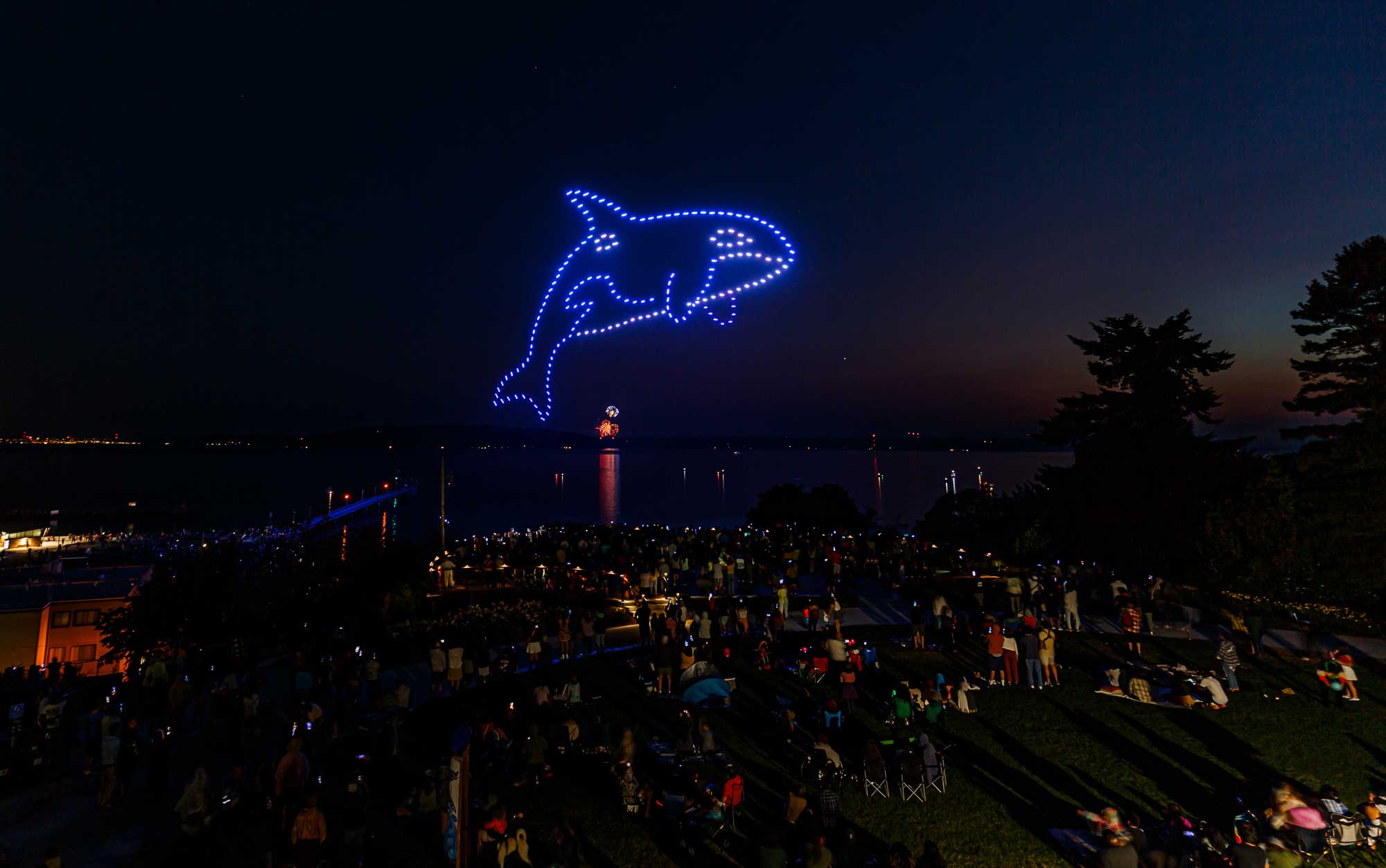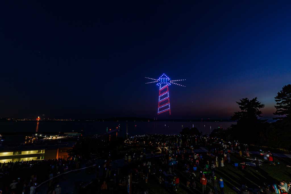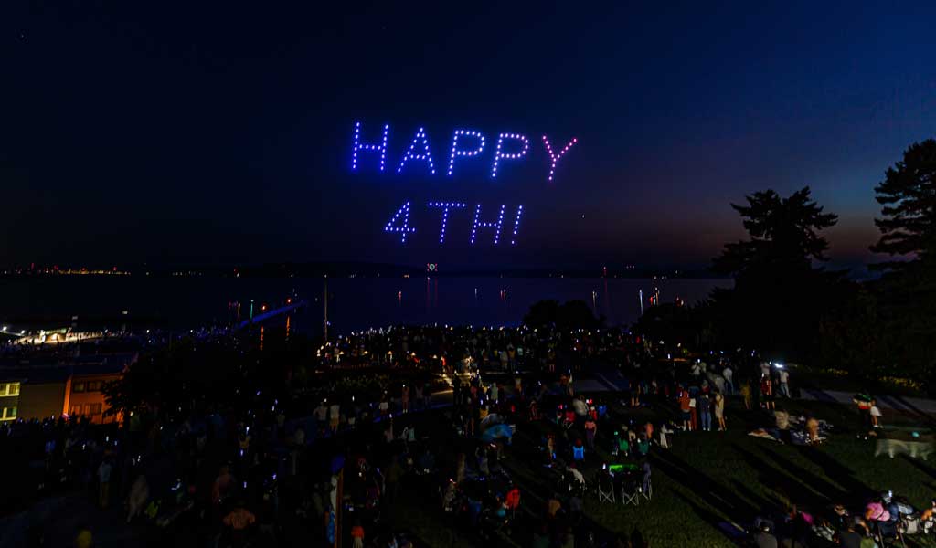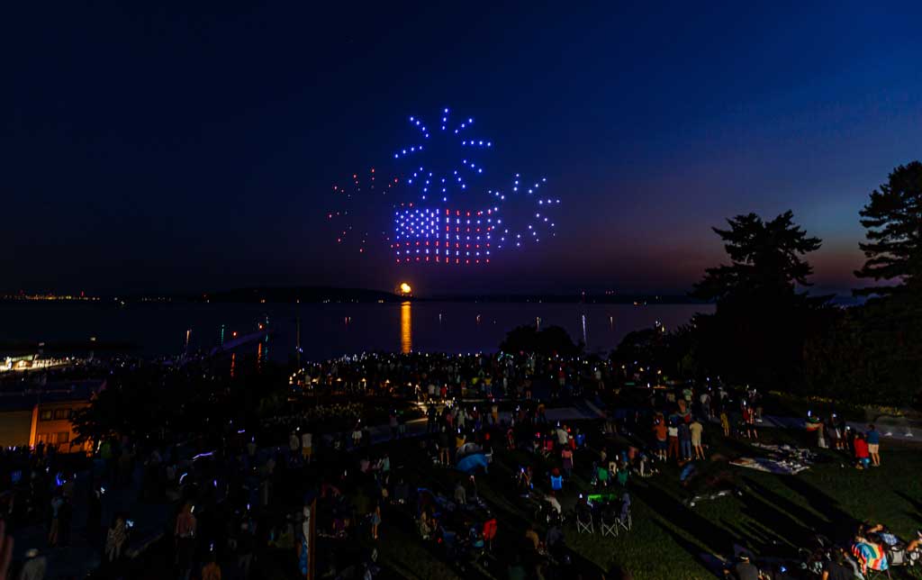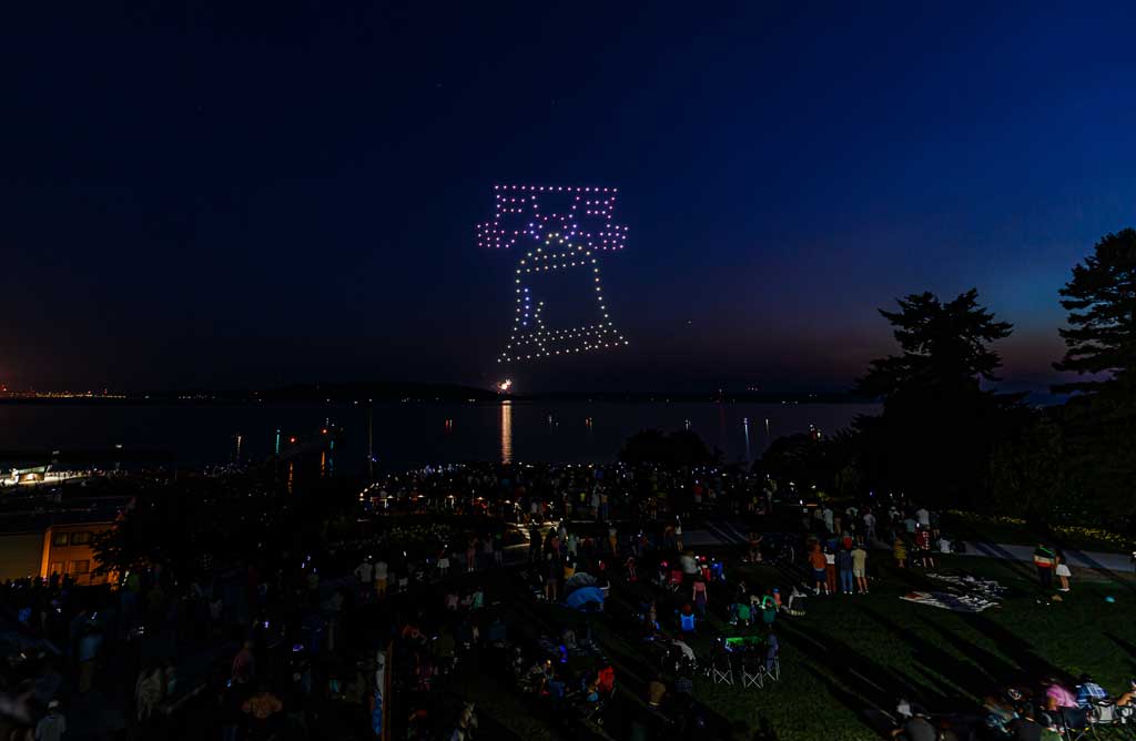 This was the first such large aerial exhibition of its kind over Des Moines, put on with 175 or so drones that made spectacular displays via computer programming – all without explosions, pollution or chemicals raining down into Puget Sound.